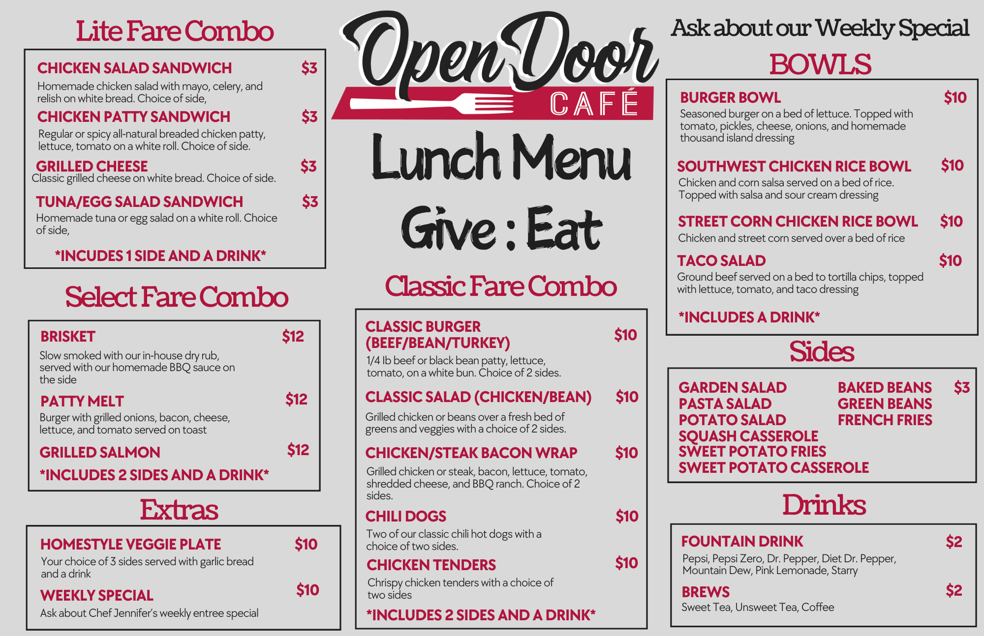 When you visit Open Door Café, your guest experience is underwritten through the generosity of individuals, bodies of faith, foundation funders, and others. Every $10 donation pays-it-forward so that the next guest volunteer enjoys a wholesome, chef prepared meal.